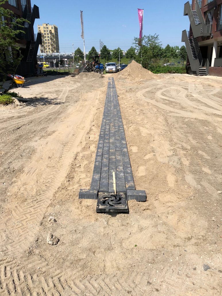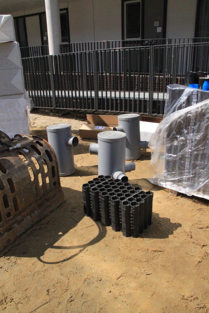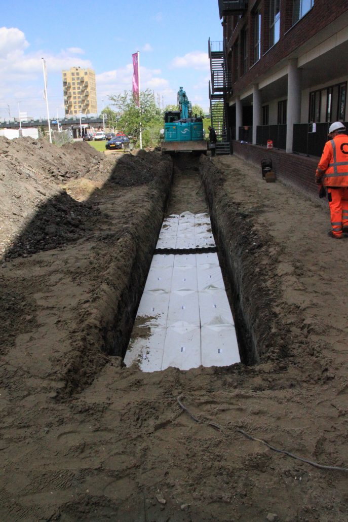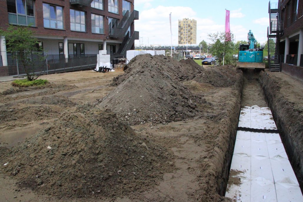 Tijdens dit project zijn relatief veel blokken ingegraven, omdat we op deze locatie te maken hadden met kleigrond. Bij een project als dit, waarbij grote infiltratie voorzieningen of regenwaterbuffers worden gecreëerd, is het vanwege optimaal kunnen gebruiken van de capaciteit, van belang om te zorgen dat de buffers goed kunnen ontluchten.