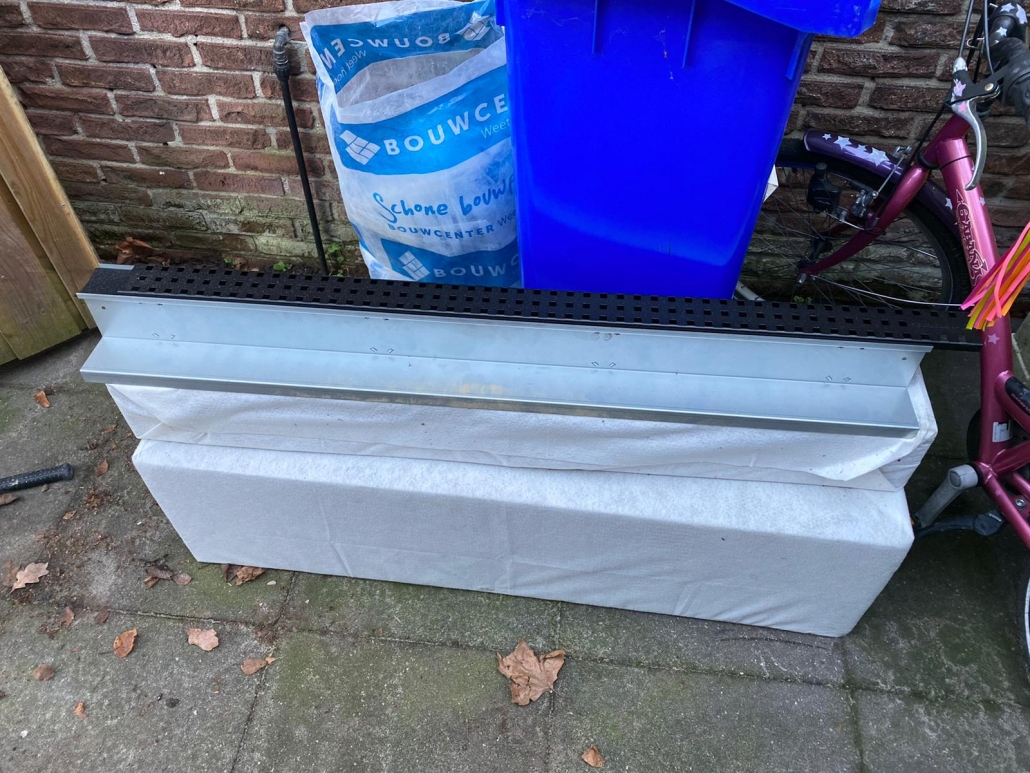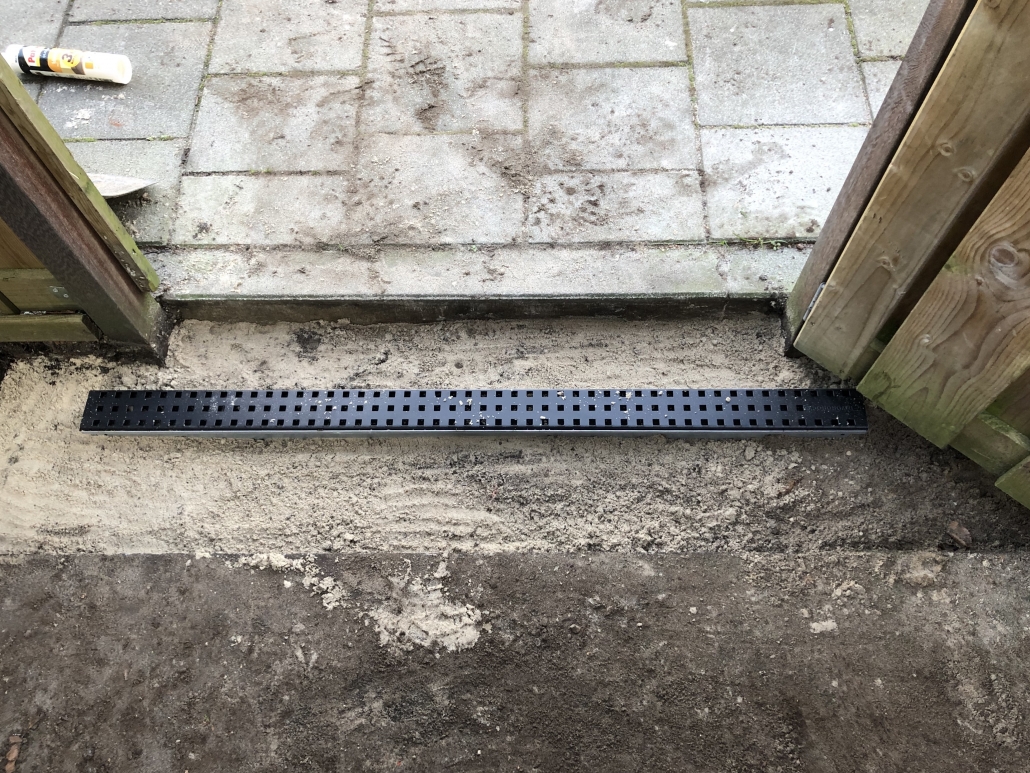 Er is gekozen voor het plaatsen van een lijngoot die rechtstreeks op een infiltratieblok van steenwol is geplaatst. De (statische) capaciteit hiervan is ca 150 liter en in combinatie met de zandbodem bijna 300 liter, hetgeen voor deze situatie voldoende is. Hiervoor is een relatief klein gat gegraven van ca 120 x 70 x 30cm (LxHxB) waar het blok in geplaatst kon worden. Verder was geen leidingwerk nodig. Voor deze oplossing is gekozen, omdat een aansluiting op riool niet wenselijk is. Bovendien is op deze manier minder graafwerk nodig geweest.